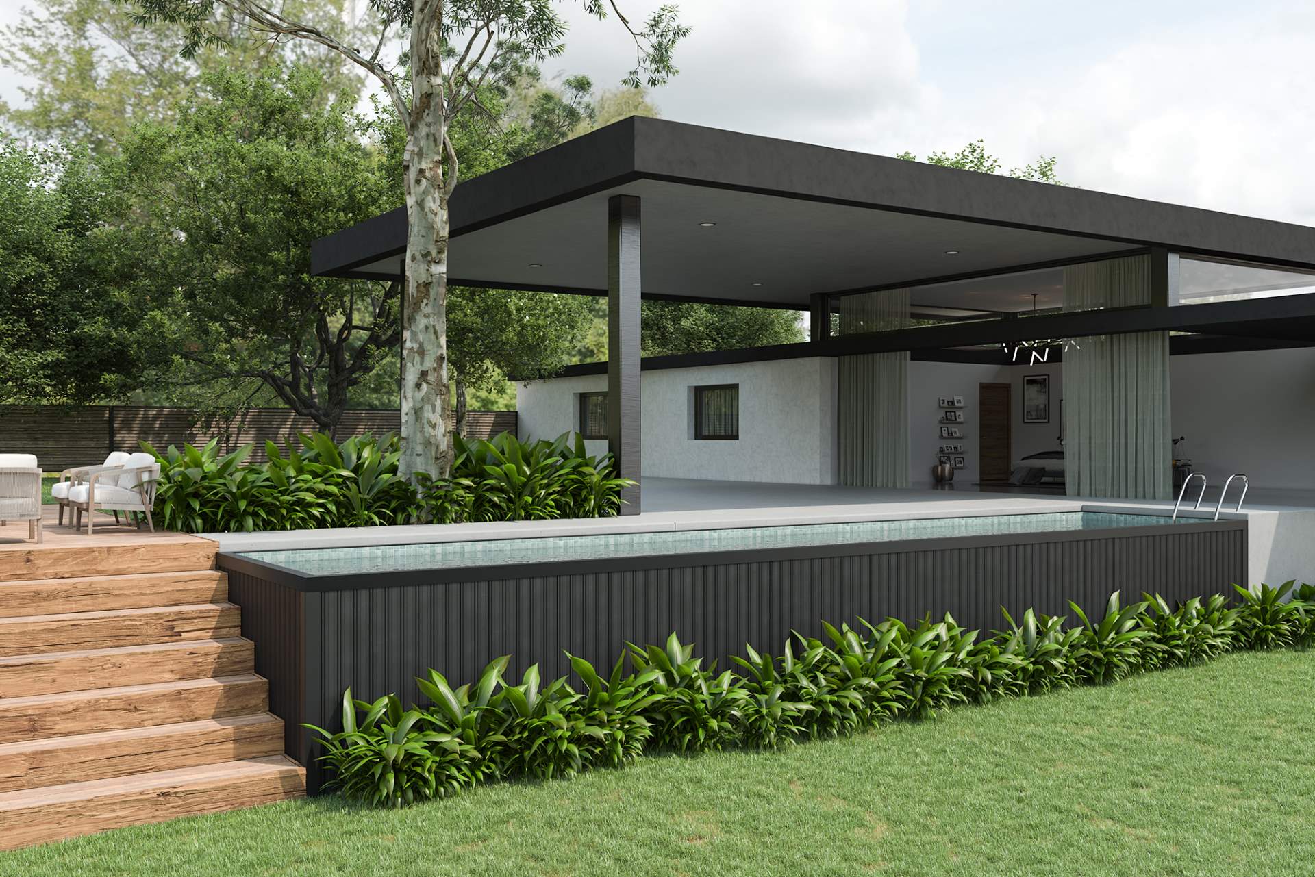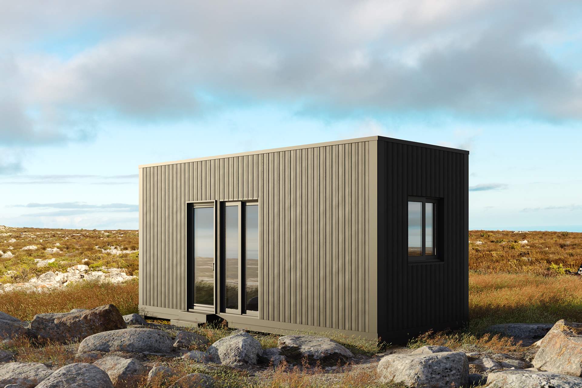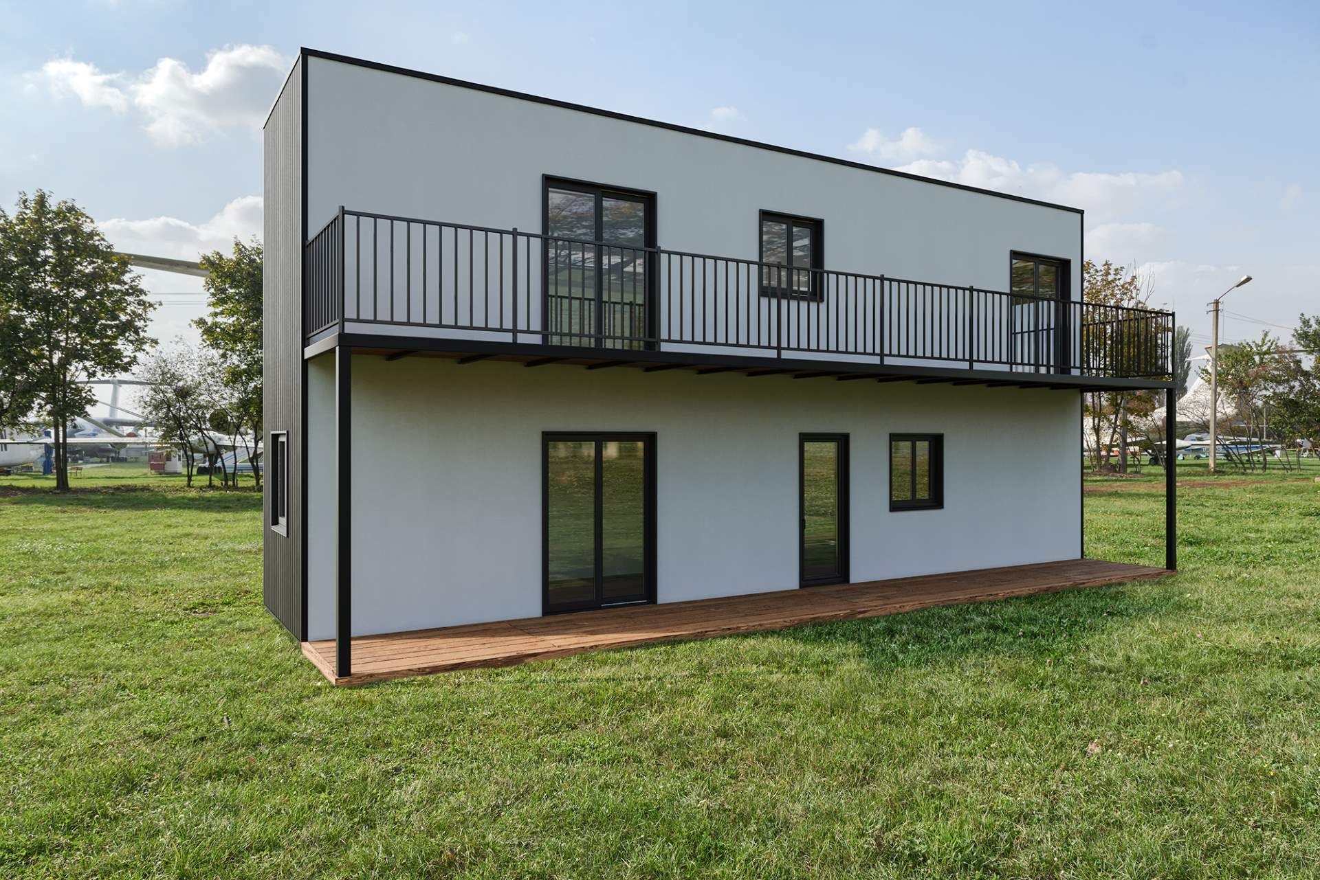 Modelo com todas as características do modelo Basic, incluindo paredes interiores, janelas de tamanho personalizável, casas de banho completas e piso (louças e piso de gama média), instalação elétrica e canalização.